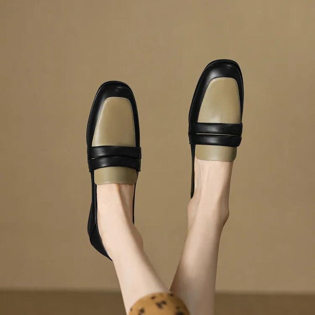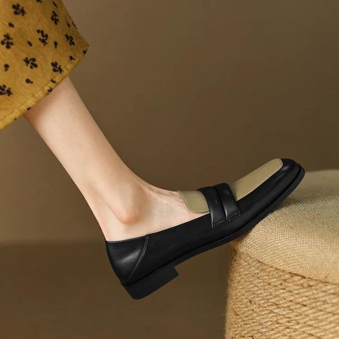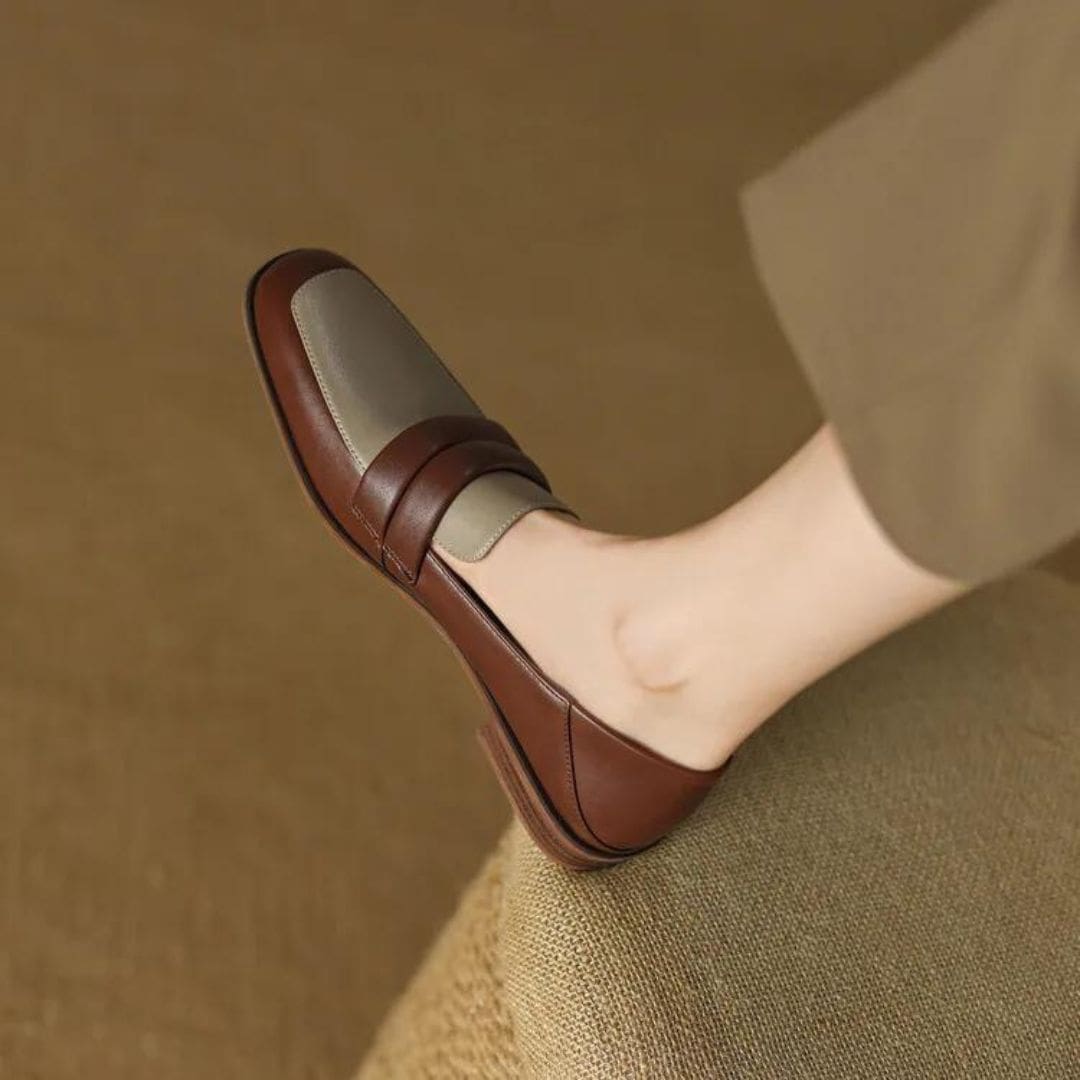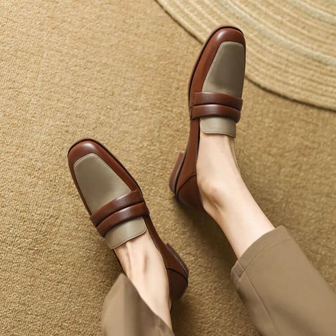 Mocassins bicolores à talon carré en cuir véritable pour femme