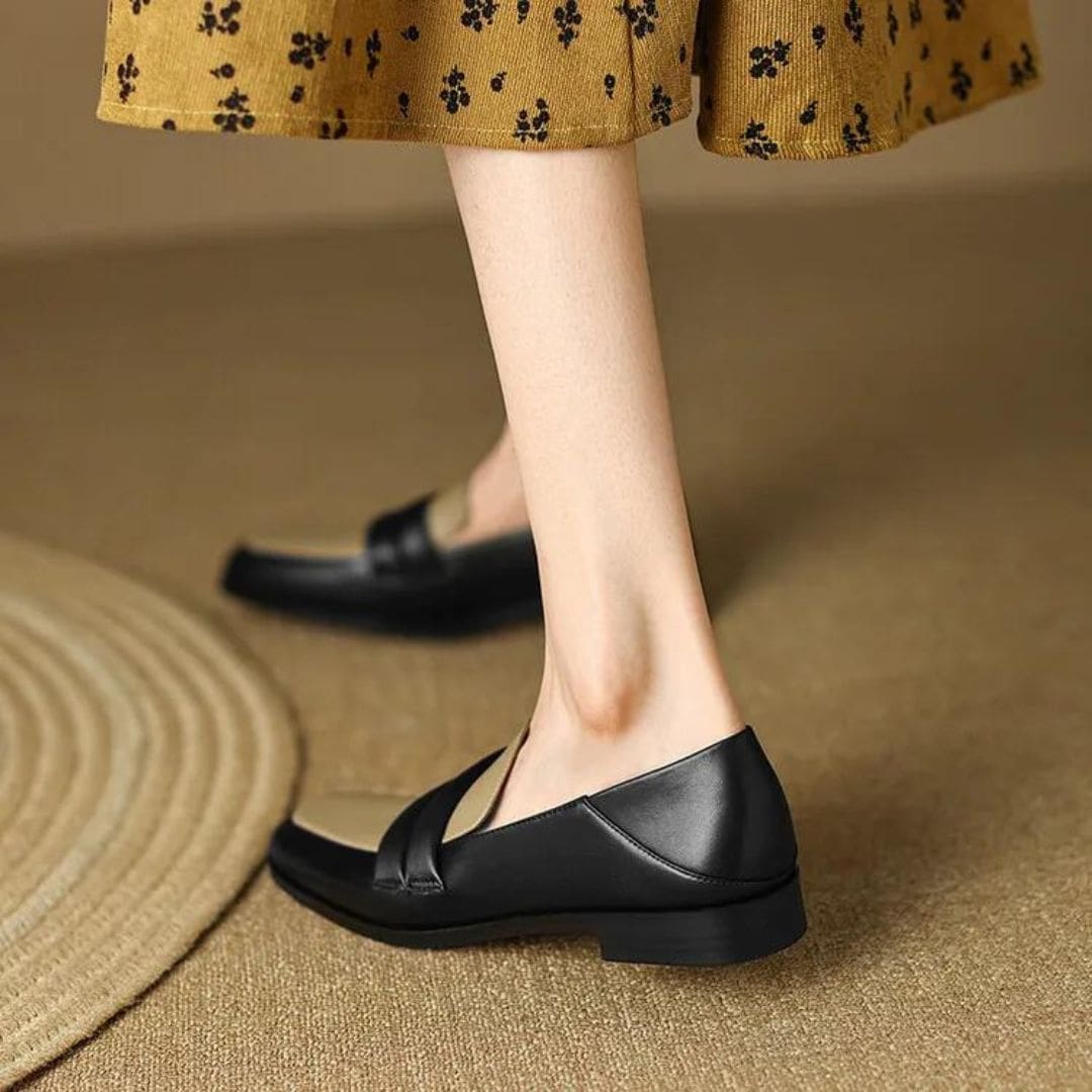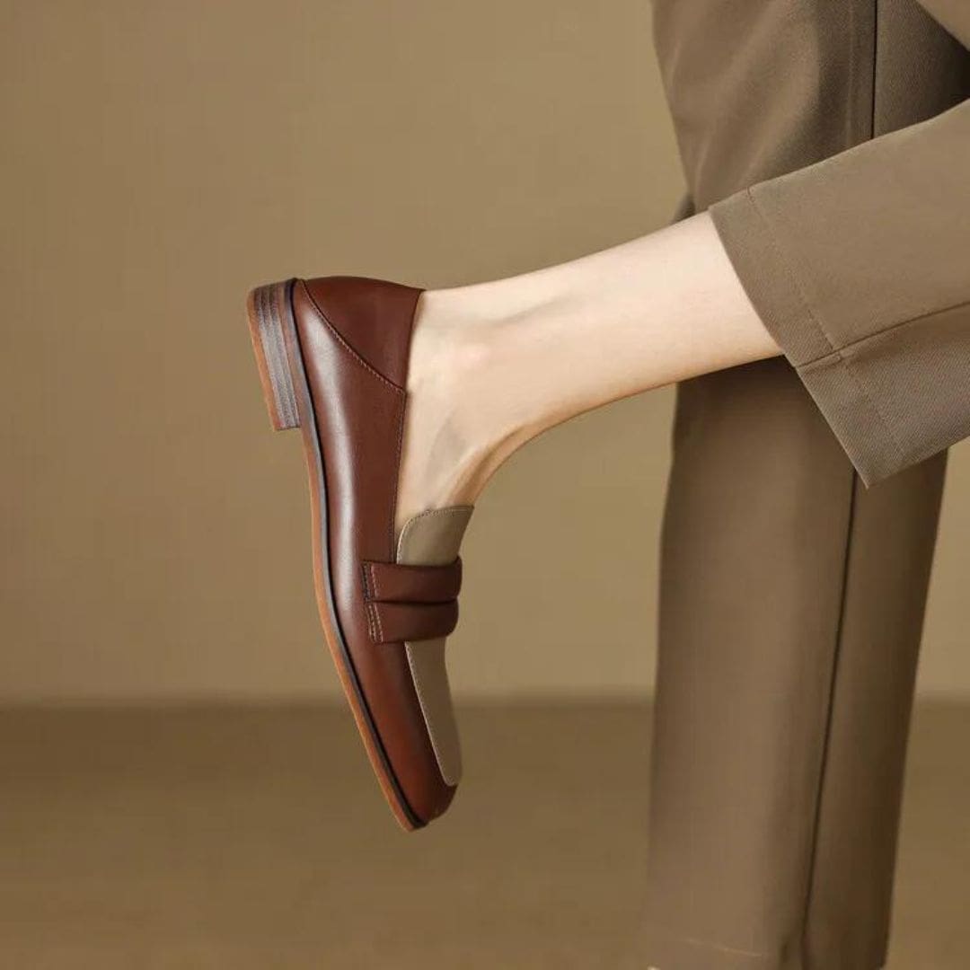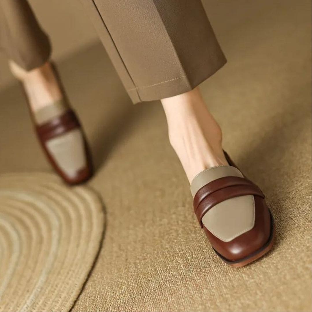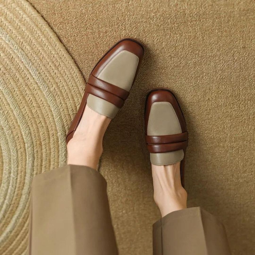 Mocassins bicolores à talon carré en cuir véritable pour femme